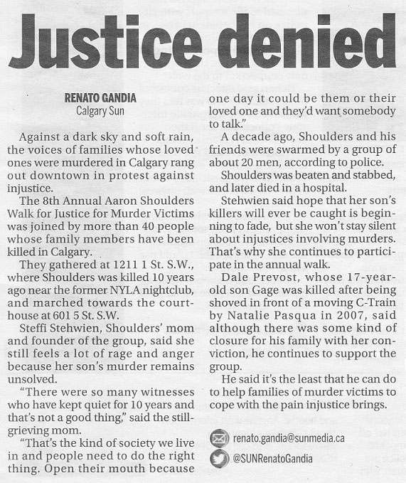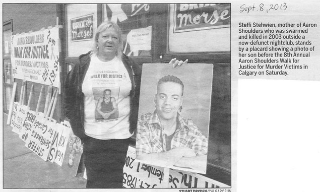 I, Steffi Stehwien, the mother of Aaron Shoulders, founded the Walk for Justice for Murder Victims in 2006. We are uniting and making a stand for Justice, we are the voices of those who are no longer here to speak! He who stands for nothing… falls for everything! If we stay silent... they stay violent!