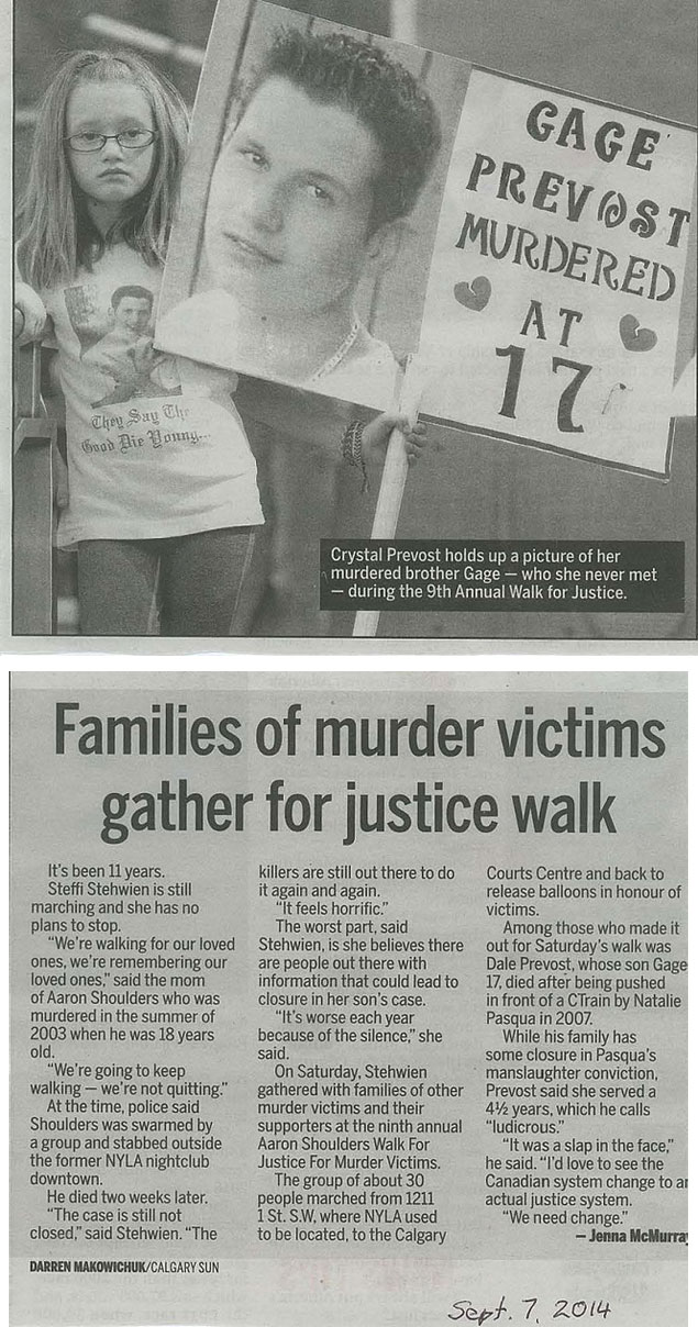 Our 9th Annual AARON SHOULDERS WALK FOR JUSTICE FOR MURDER VICTIMS INTERNATIONAL, was held on September 6th in Calgary. The weather wassunny and warm (perfect). Yet our number was smaller than the previous years, our voices rang strong and loud as we walked through the downtown core. This just proves it is not the number but the commitment and conviction that makes it powerful.