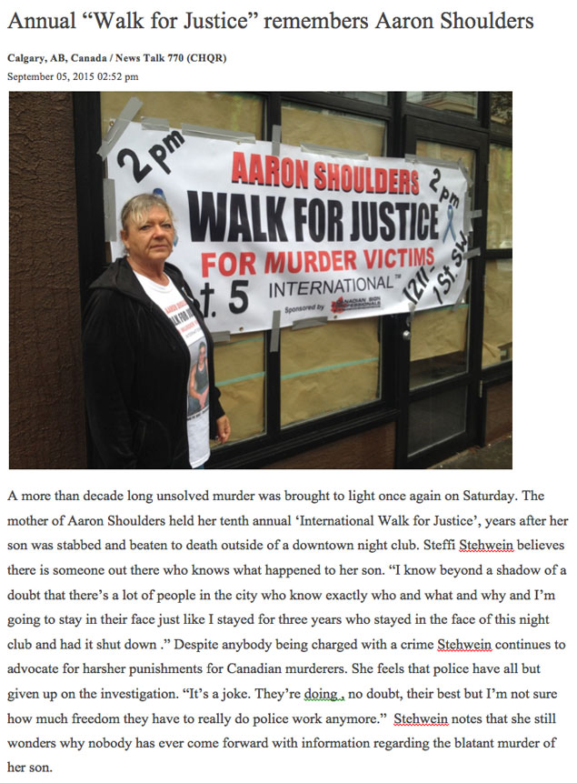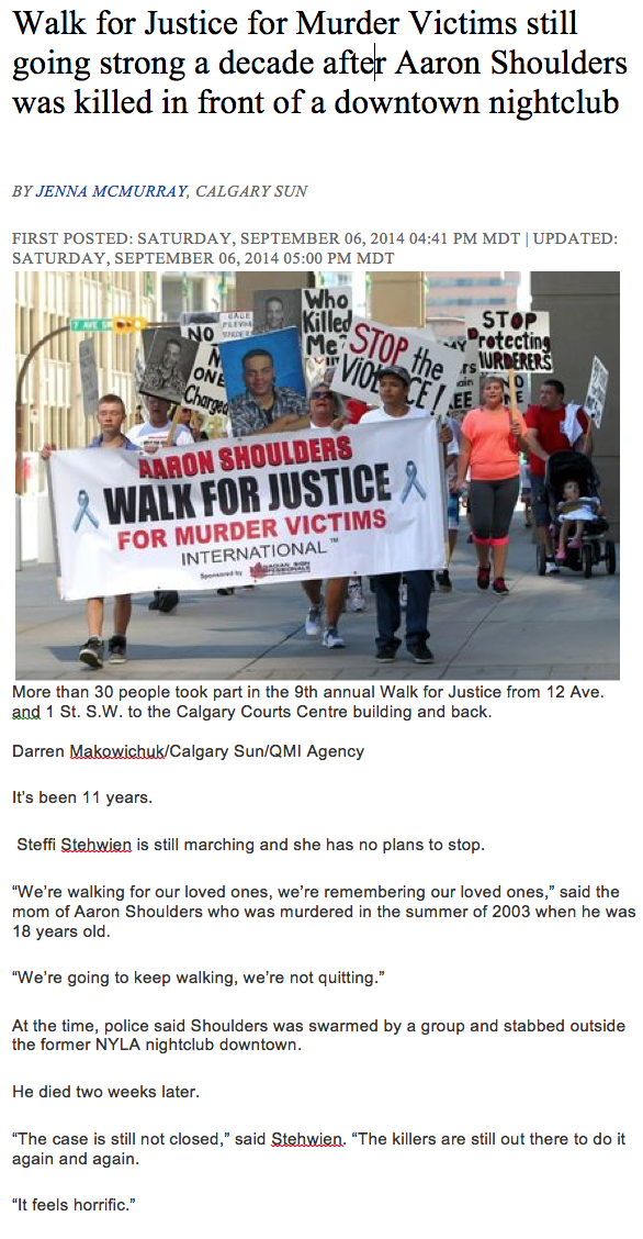 I, Steffi Stehwien, the mother of Aaron Shoulders, founded the Walk for Justice for Murder Victims in 2006. We are uniting and making a stand for Justice, we are the voices of those who are no longer here to speak! He who stands for nothing… falls for everything! If we stay silent... they stay violent!