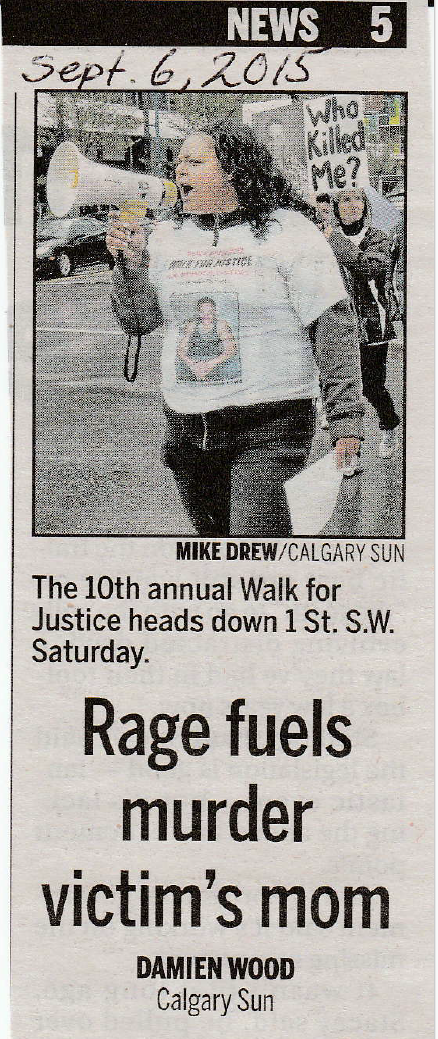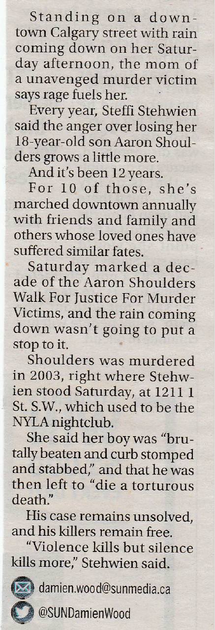 Our 10th Annual AARON SHOULDERS WALK FOR JUSTICE FOR MURDER VICTIMS INTERNATIONAL, was held on September 5th in Calgary. The weather was somber as the event.. cold and wet; as if the heavens filled our city with tears for our murder victims and the horrific injustice done to them! Our attendance was small due to the rain compared to previous years; however our voices rang strong and loud as we walked through the downtown core. This just proves it is not the number but the commitment and conviction that makes it powerful.